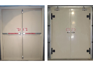 隧道人行横洞防火门采用大型门轴式合页, 门上的安装专用推閂式机械逃生门锁(推杠锁),门底部设置有门底框及防火、防烟密封条,并装设自动闭门器和顺序器,抗风压性能强。门扇内应填充防火材料,门框内应填充防火材料。